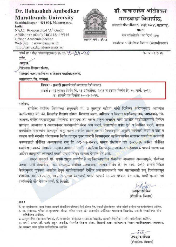 छत्रपती संभाजीनगर (औरंगाबाद): अशासकीय अनुदानित महाविद्यालयाच्या प्रभारी प्राचार्यपदी अनुदानित तुकडी किंवा विषयाच्या प्राध्यापकाचीच सेवा ज्येष्ठतेनुसार नियुक्ती करावी, असे महाराष्ट्र शासनाचे धोरण आणि नियम असताना जालना जिल्ह्यातील जाफ्राबाद येथील १०० टक्के अनुदानित सिद्धार्थ महाविद्यालयाच्या प्रभारी प्राचार्यपदी त्याच महाविद्यालयात कार्यरत असलेल्या कायम विनाअनुदानित विषयाच्या प्राध्यापकाचीच नियुक्ती करण्यात आल्याचे आणि या नियुक्तीला डॉ. बाबासाहेब आंबेडकर मराठवाडा विद्यापीठाने मान्यताही दिल्याचे धक्कादायक प्रकरण न्यूजटाऊनच्या हाती आले आहे.